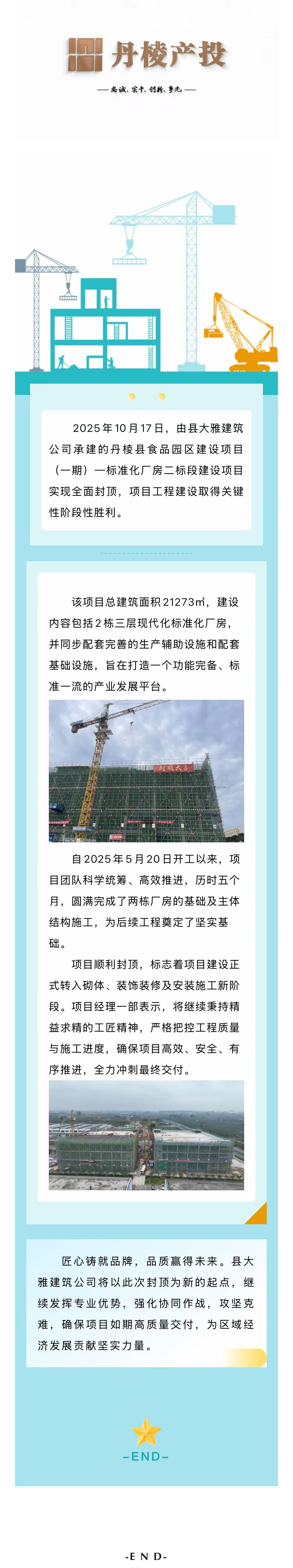 【縣大雅建筑公司】丹棱縣食品園區(qū)建設(shè)項目(一期)—標準化廠房二標段建設(shè)項目順利封頂